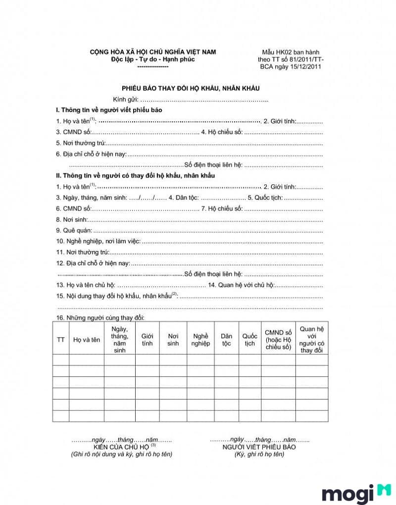 - Phiếu báo cáo thay đổi nhân khẩu, hộ khẩu theo mẫu HK2: 01 bản